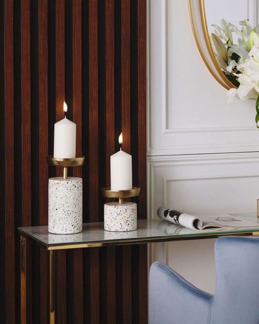 Design og eleganceDette smukke sæt lysestager kombinerer moderne form med funktionalitet. Basen er lavet af et slidstærkt og trendy terrazzo-materiale, mens de gyldne holdere på slanke ben kan rumme både...
