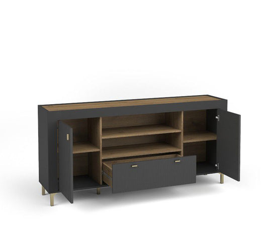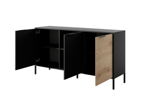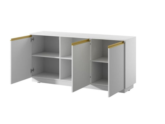Design og eleganceTre-dørs kommode Roy kombinerer stil og funktionalitet og er et fremragende valg til det moderne hjem. Frontene er lavet af MDF-plader med elegant rillet mønster, og en dekorativ...