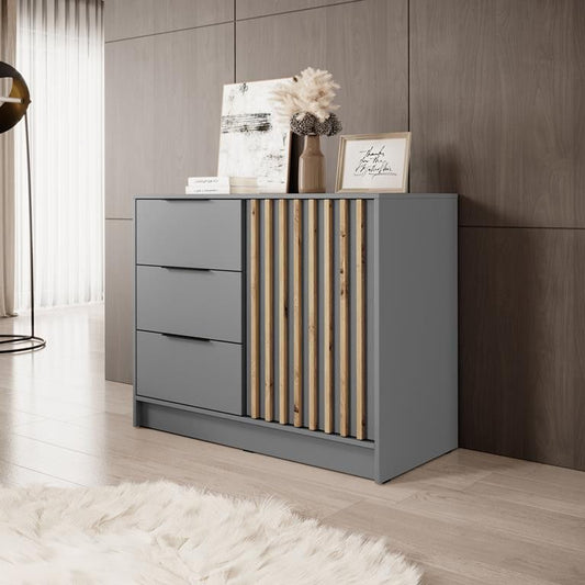 Design og eleganceDen moderne Nelly kommode har en dekorativ front med lameller, der tilfører et tredimensionelt udtryk og giver kommoden et stilfuldt udseende. Den grå farve på fronten og bordpladen...