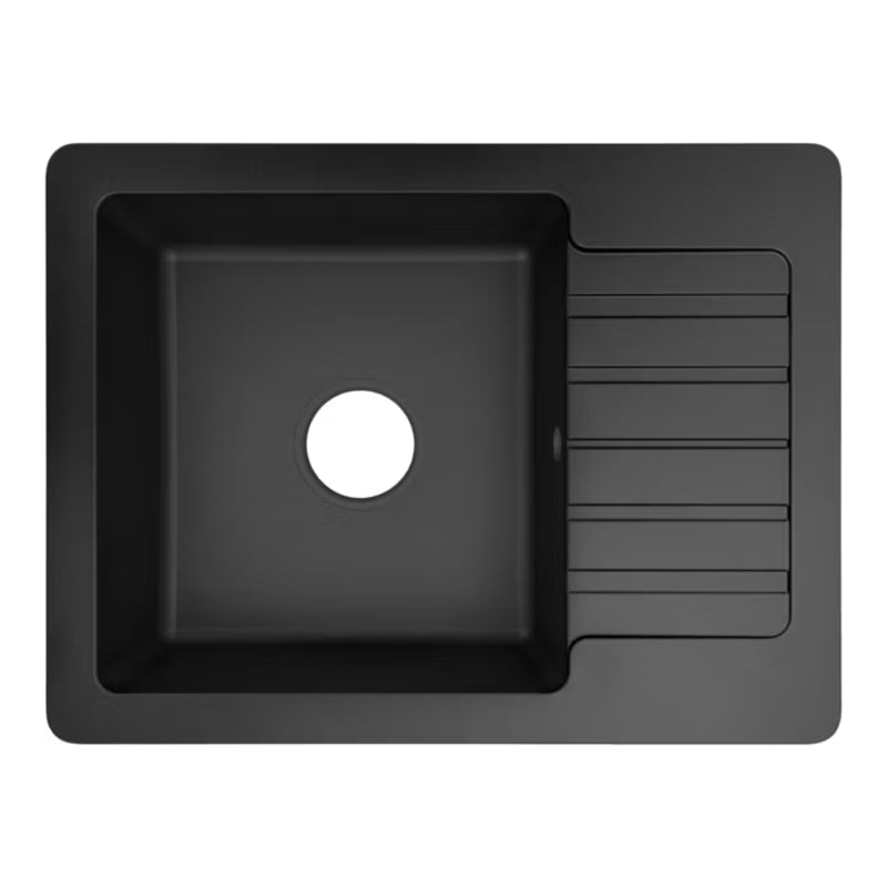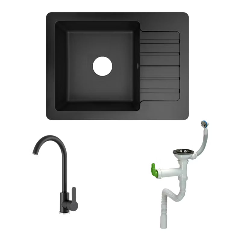 En granitkøkkenvask i kompakt størrelse med tilhørende sort armatur, designet til moderne hjem. Overfladen i granit giver både styrke og en stilfuld matsort finish med let metallisk spil, som tilfører køkkenet et elegant udtryk. Den kompakte udformning gør den ideel til mindre køkkener, tekøkkener eller som ekstra arbejdsplads, uden at gå på kompromis med funktionalitet.